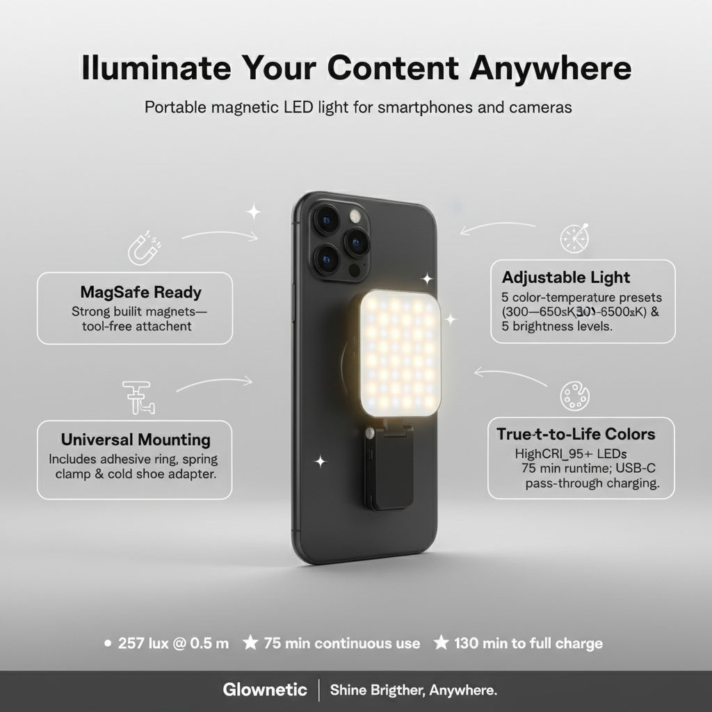 Glownetic features a magnetic attachment with built-in magnets and an adhesive metal ring, making it a breeze to snap onto any phone or surface. Its universal spring-loaded clamp grips surfaces up to 0.6″ thick, and the cold shoe adapter lets you mount it on cameras, tripods, or selfie sticks for ultimate flexibility.